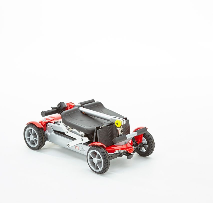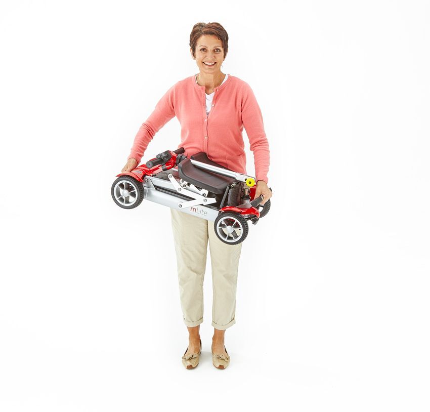 mLite folding mobility scooter weighs just 17.8kg making it the lightest folding mobility scooter on the UK market. The easy to remove lithium battery pack weighs just 1.85kg and offers the option of both on or off board charging. The battery even has a handy status indicator to show quickly when removed how charged the battery is.