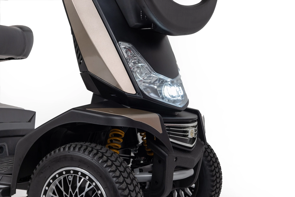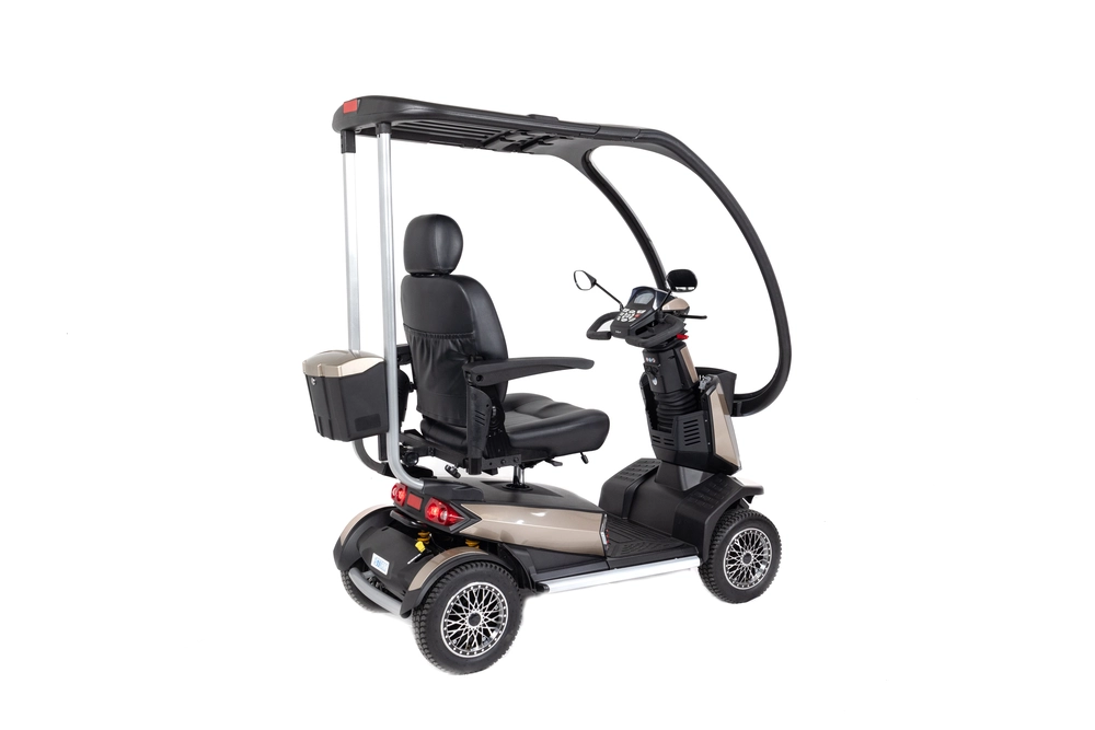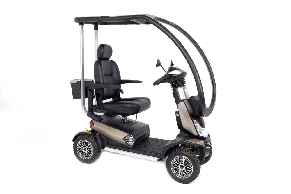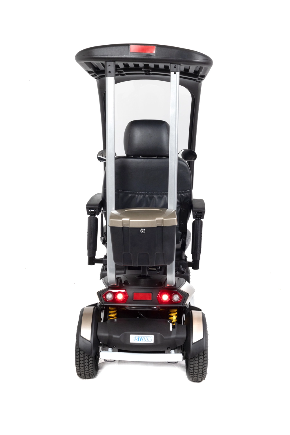 The Storm+ is a road-legal mobility scooter featuring full suspension, hard canopy, rear storage, a 24-mile range, and a 30-stone capacity.