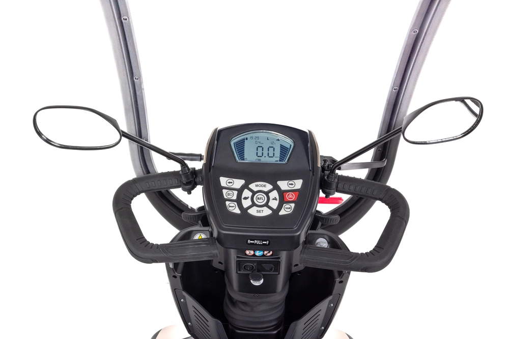 The Storm+ is also designed with safety and practicality in mind. As a Class 3 mobility scooter, it includes front and rear lights, indicators, mirrors and a horn, ensuring full road compliance. The large pneumatic tyres provide excellent grip and stability, while the responsive braking system ensures safe stopping in all conditions. The intuitive control panel makes operation simple, even for first‑time users.